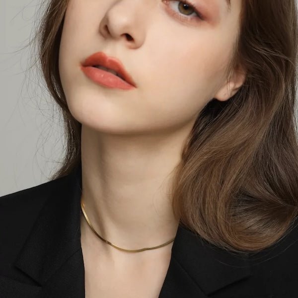 Des maillons en V étroitement imbriqués formant un ruban plat et brillant : la chaîne serpent réinventée en chevron.
