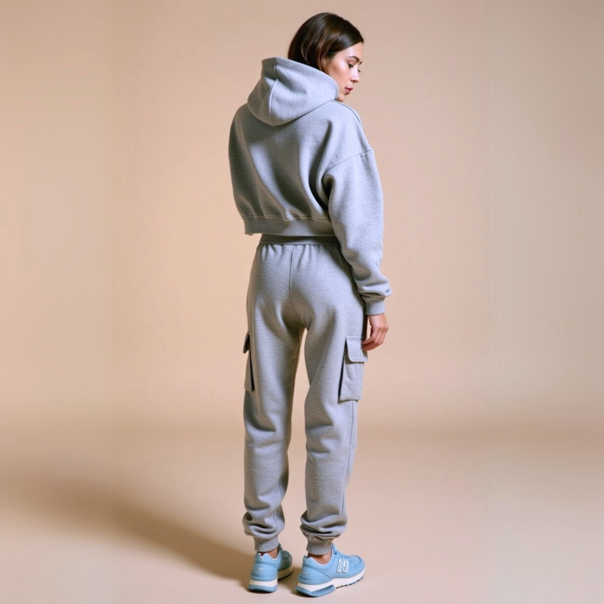 • Coupe : Silhouette courte oversize avec ligne ample et carrée, épaules tombantes, capuche ajustable et poches kangourou cachées à glissière.