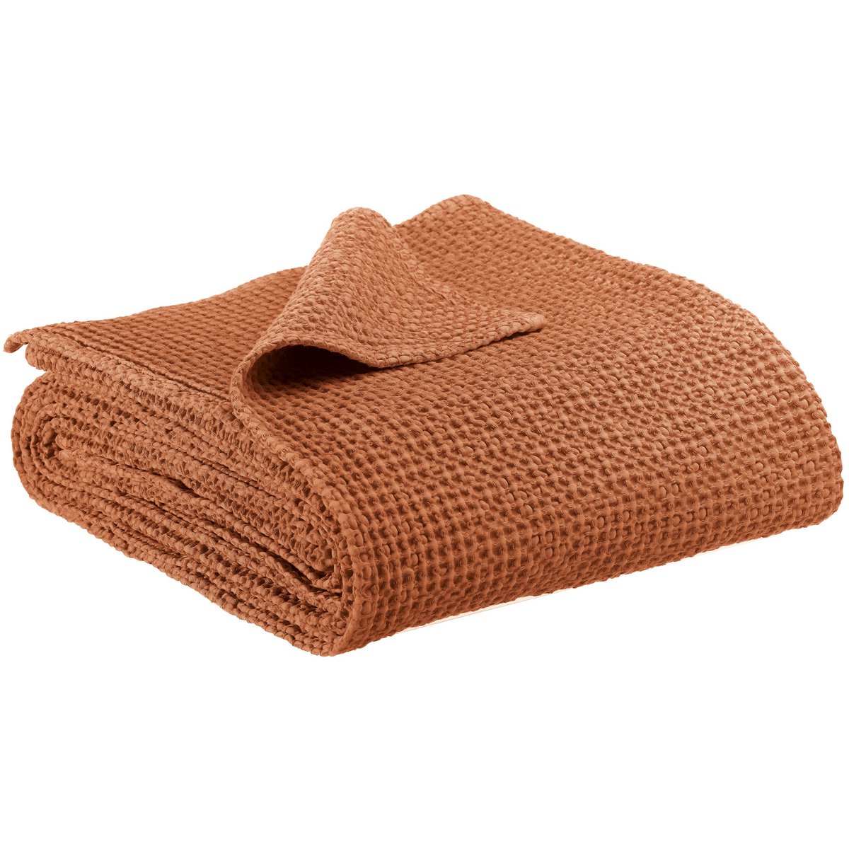 Roux lumineux aux accents métalliques, Cuivre rayonne d'une chaleur sophistiquée et enveloppante. Le plaid Maia marie texture gaufrée nid d'abeilles et coton recyclé — un incontournable de la Maison VIVARAISE, stonewashed pour un tombé naturellement froissé et élégant.